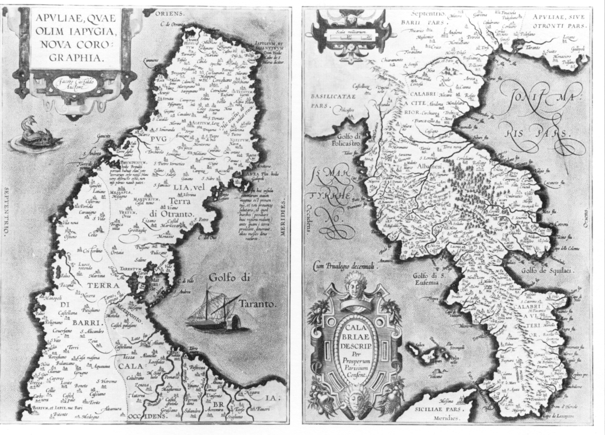Some of the single page Ortelius maps are paired on plate, while others are printed from separate plates and combined on one mapsheet. Thus the map of Apulia appears with Calabria in one case, and with Padua in another.