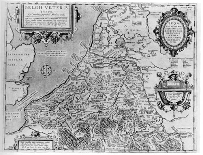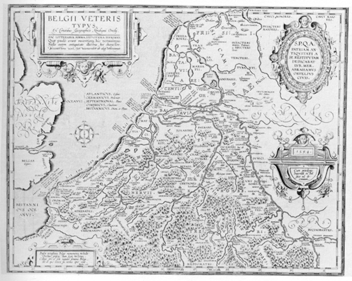 Some Ortelius maps were published for more than forty years. When comparing apparently identical maps it must be established if they were printed from the same plate and, if so, whether that has been reworked. The Ortelius atlas includes two versions of the historical map of the Low Countries printed from different plates. They are dated 1584 and 1594 respectively on the lower of the two cartouches at the right hand side.