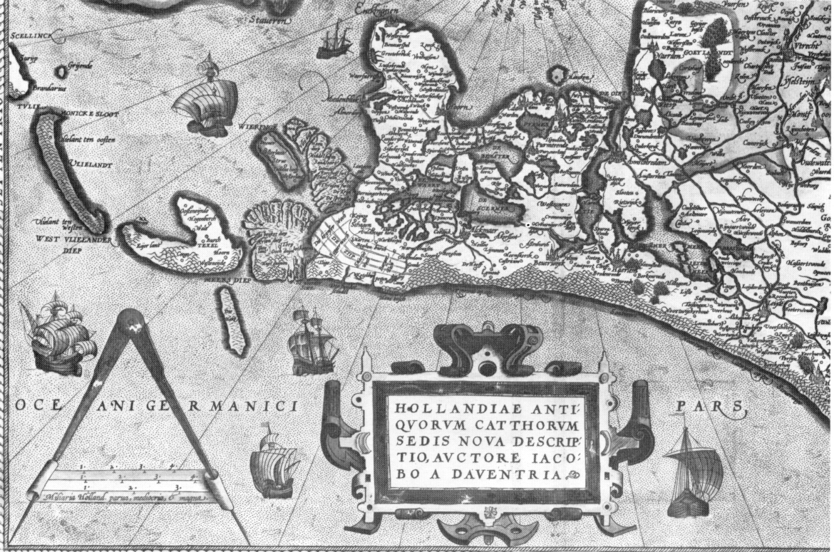 Two details of the Holland map from early (1575 Latin) and late (1603 Latin) editions of the atlas show a thorough reworking of the sea area, where the waves are replaced by stippling. The original waves are still faintly visible on the later map.