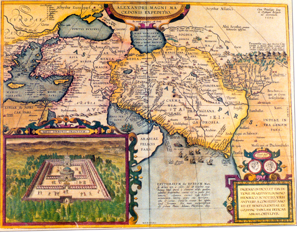 This map shows the area where Alexander the Great made his conquests, beginning in Egypt, where the Ammon-Jupiter oracle (see lower left) welcomed him as "Son of Zeus" and predicted a great future for him. The numerous cities in Persia called Alexandria which he founded are also shown.
