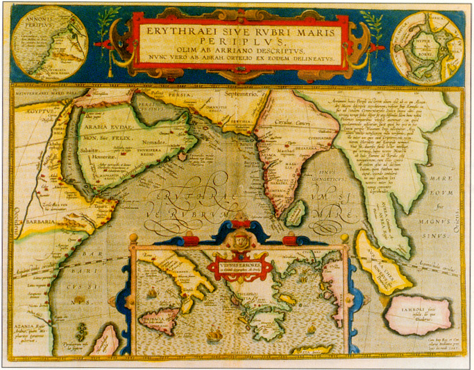The red sea, which in Ortelius rendering of classical knowledge extends along both sides of the Indian peninsula, does not derive its name from being red, but from Perseus' son Erythras (the red king) who was buried on some island in this sea. Note the relatively accurate representation of the Indian continent and the IndoChinese/Malaccan peninsula. The inset map shows the various places that Ulysses visited on his wanderings from Troy to his native Ithaca, as first described in Homer's Odysse. This new plate (39P/IV) is different from its predecessor (37P) in being slightly larger, and in having more text and a different cartouche.