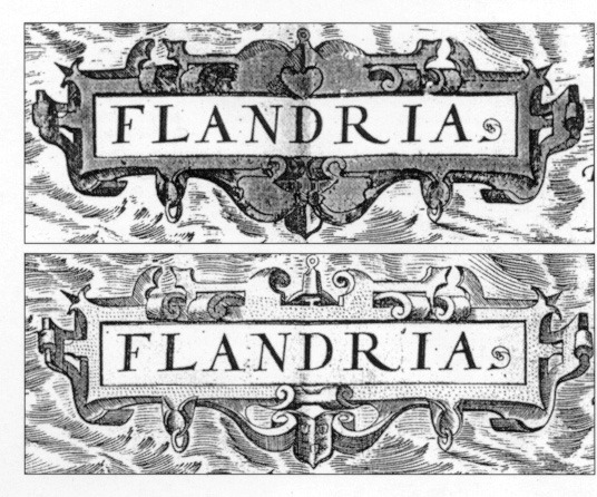 Two states of the cartouche of the Flandriae plate,occurring in two exemplars (Leiden University and Amsterdam University) of the first version of the first edition of the Theatrum, (Koeman's Ort 1A). The Leiden exemplar shows a heart, the Amsterdam exemplar does not.