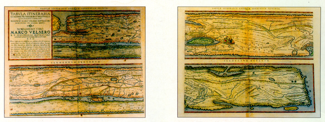 The sheets form a road map. The North-South dimsension is heavily crushed. The first segment begins with England and Spain. Most space and greatest accuracy is devoted to Italy and Greece (segments 2-5). The Roman world ends in the east with the river Ganges and island of Ceylon. Shown here are the first and last segment.